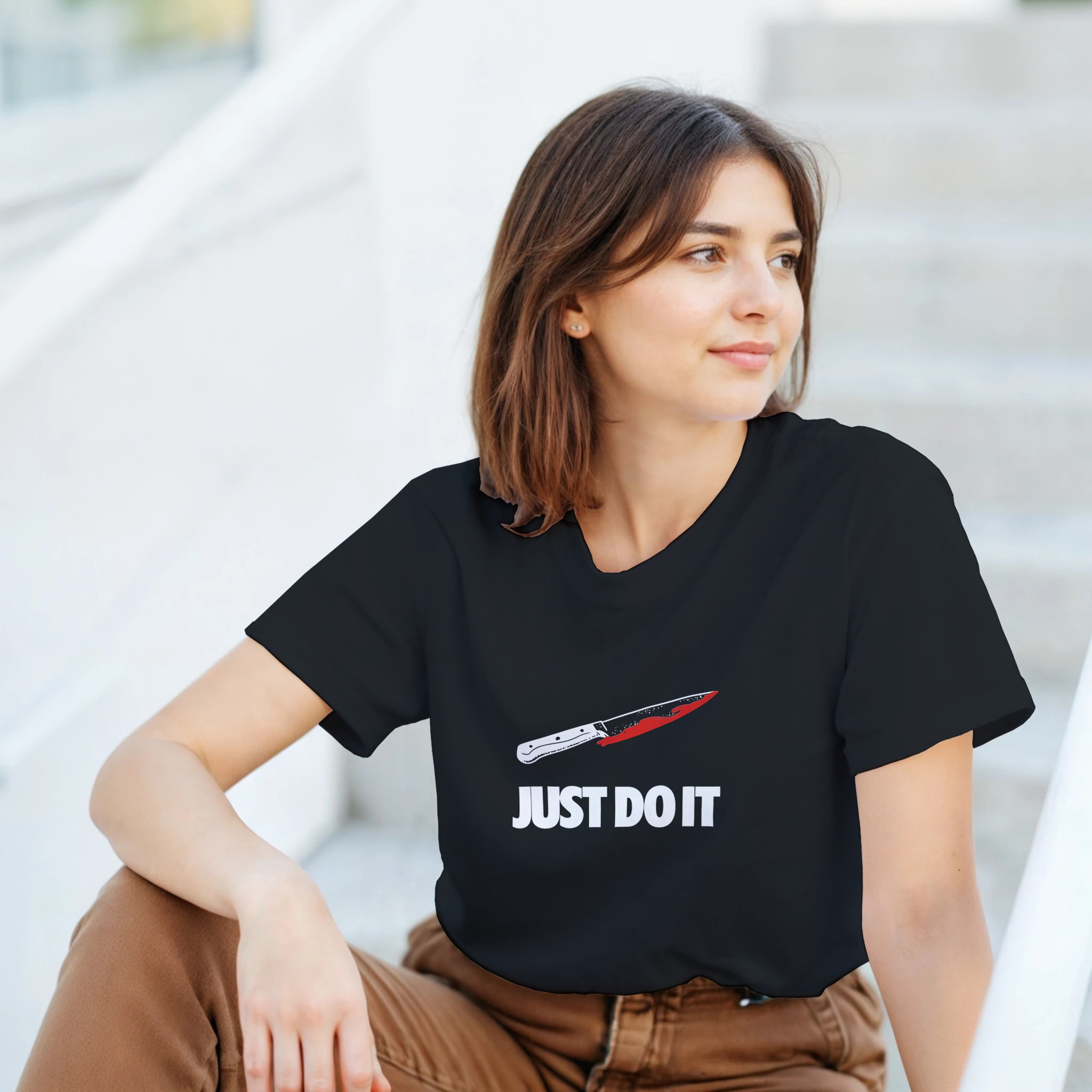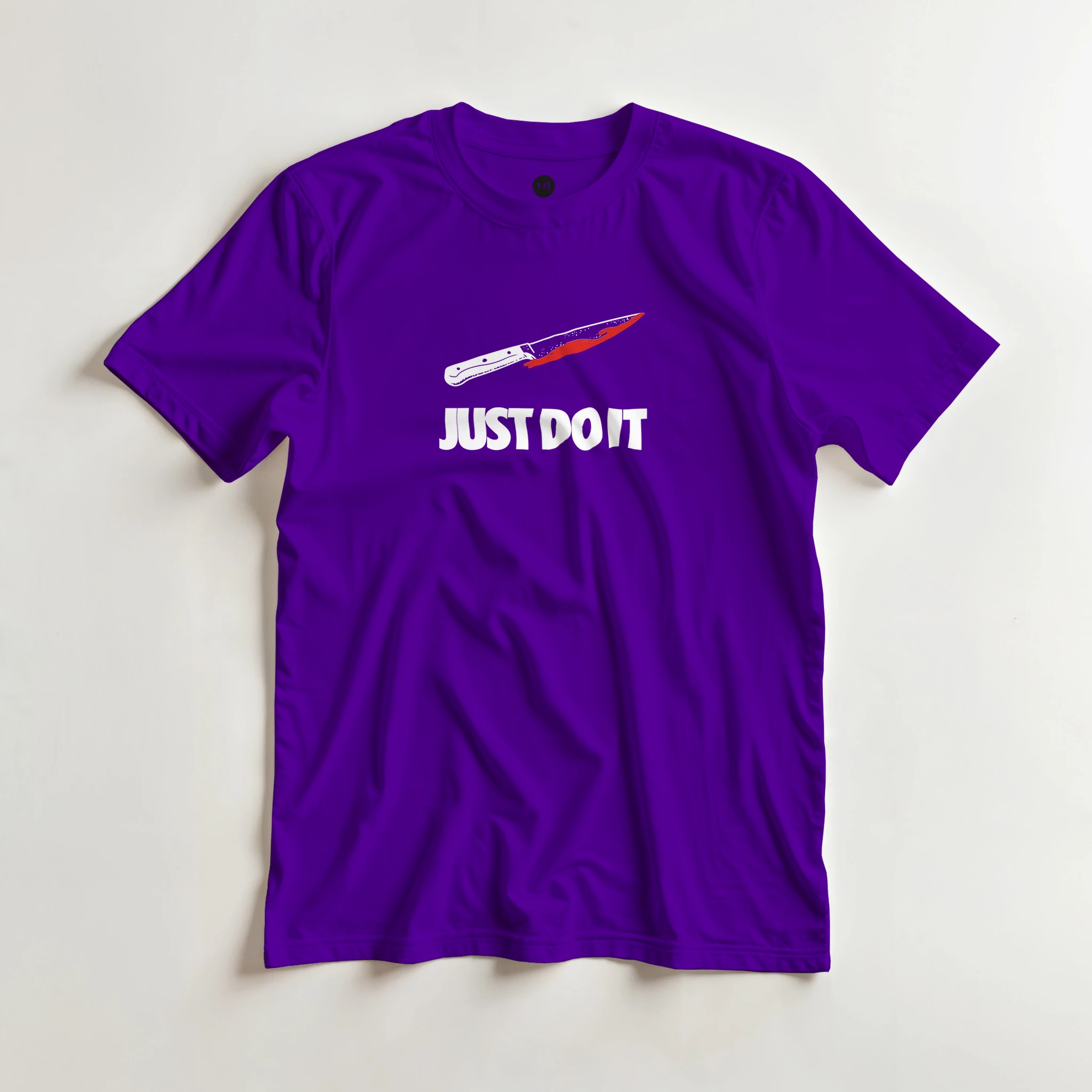 This “Just Slay It” T-shirt puts a darkly funny spin on the world-famous slogan, swapping motivation for mischief. Featuring a clean knife graphic above bold lettering, it’s the perfect mix of spooky humour and streetwear style.